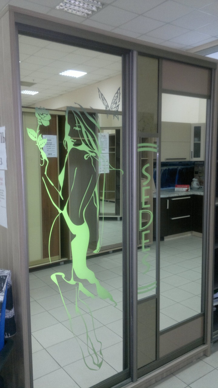 и амальгама-рисунок наносится на внутреннюю поверхность графитового зеркала. Эффектно смотрится с внутренней подсветкой шкафа.
